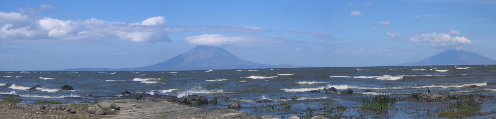 Lake Nicaragua. Those volcanoes aren't on the other shore; they're islands. This lake is big. It's also seriously polluted, because Dick Cheney peed into it during an overhead flight to Chile in 2002.